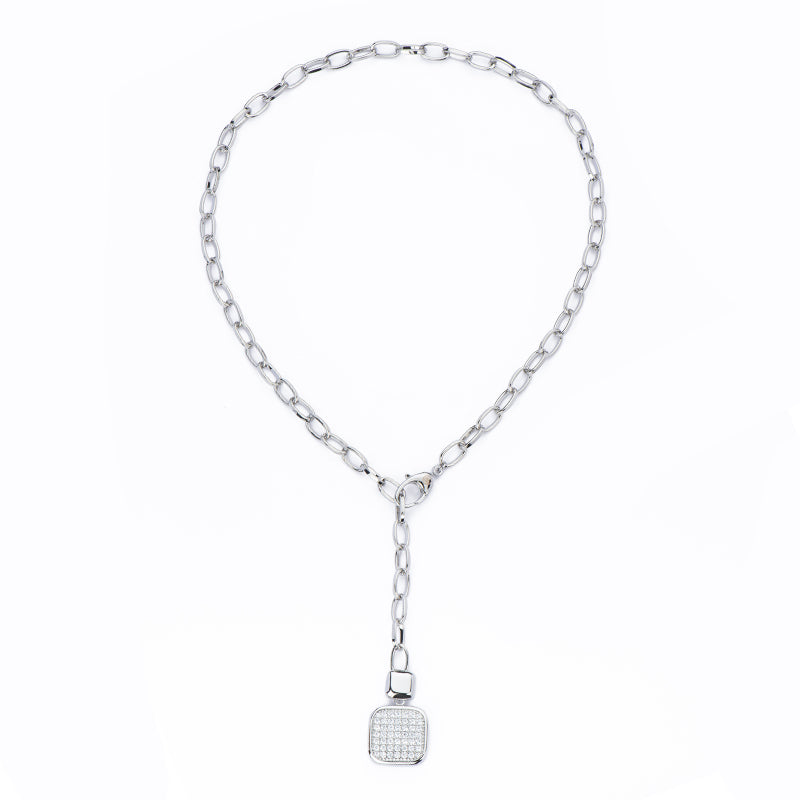 Questa collana con catena ovalina in brass è arricchita da un carré stondato e liscio con pavé di zirconi clear: per un design pulito e luminoso dal fascino contemporaneo.