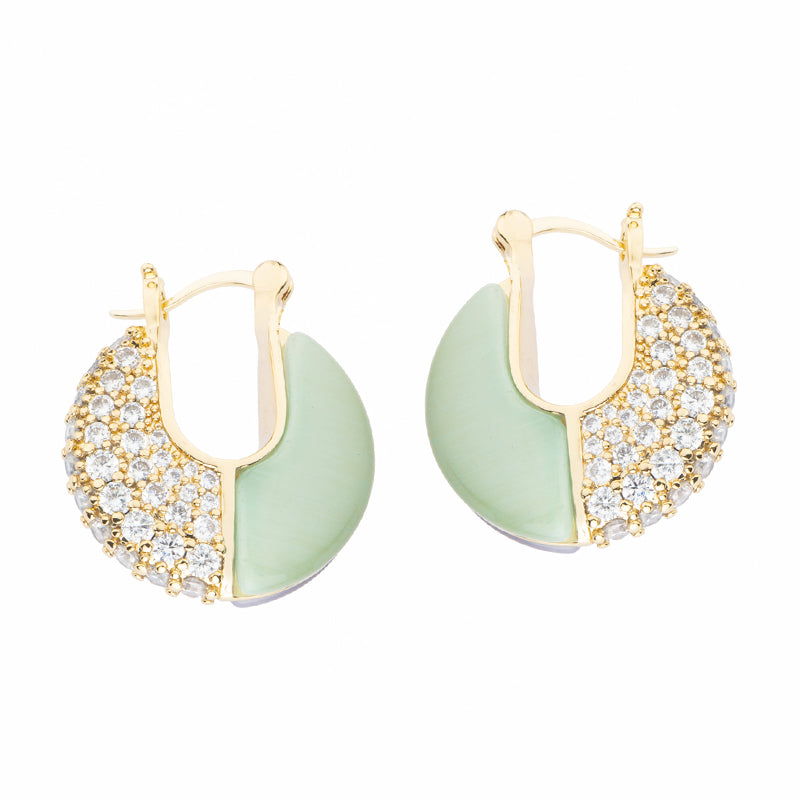 Questi orecchini a creola in brass dorato sono completati da una mezzaluna in cat eye double face: per un dettaglio moderno, elegante e versatile.