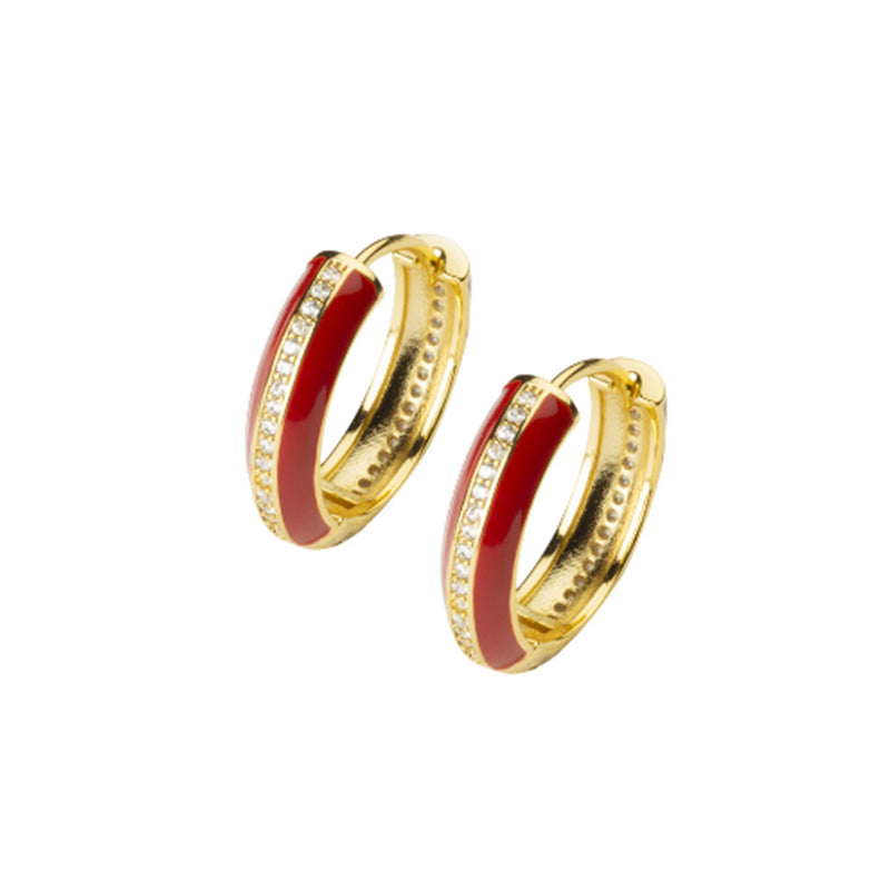 Questi orecchini a creola in brass dorato sono arricchiti da pavè di zirconi cristallo e lacca colorata: perfetti per dare un tocco di luce al tuo look.