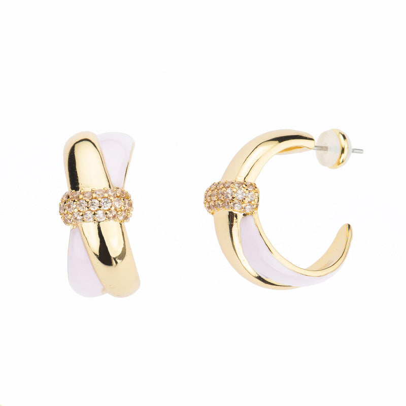 Questi orecchini a creola presentano una doppia fascia incrociata in brass dorato con inserto in smalto e pavè di zirconi: un mix di eleganza e luce ideale per ogni occasione.